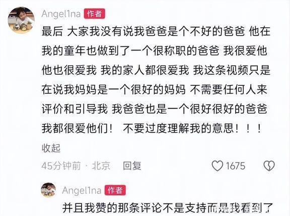 虽然甜馨很快就说清楚了,自己点那个赞只是因为看见了那条评论,并不是在支持, 她爸是个好爸爸,她也很爱他们。这主评论没点赞,反而一不小心点了回复的赞,确实说不太过去,但甜馨的回复还是把这出闹剧给收尾了。